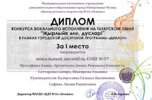 с победой в конкурсе вокального исполнения на татарском языке «Споём, друзья!» в рамках городской досуговой программы «Диалог» ансамбль девочек 4В класса нашей школы Арсентьеву Диану, Мустафину Элину, Романову Елизавету, Саттарову Самиру, Шакирову Эльвину. Девочки, молодцы!16 нчы санлы балалар иҗат үзәгендә үткән татар телендә “Җырлыйк әле, дуслар!” җыр бәйгесендә 1 урын яулаган кызлар ансамбелен котлыйбыз. Җитәкчеләренә һәм кызларга рәхмәт белдерәбез, алда да уңышларга ирешүләрен телибез! -