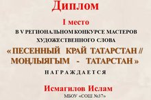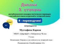 Конкурс приуроченный к Году наставника и педагога, проводился в заочной форме и представлял с собой художественный перевод стихотворения с английского языка на русский и татарский язык. Руководитель: учитель родного (татарского) языка и литературы Сахабетдинова Лилия Аксановна.5 нче сыйныфы укучысы Мостафина Карина, В.Г. Тимирясов исемендәге Казан инновацион университетының Чаллы филиалы ярдәме белән үткәрелгән, "Мин-тәрҗемәче!» 2023 дип аталган республика шигъри тәрҗемәләр конкурсында катнашып, 2 нче дәрәҗәле дипломга лаек булды. Остаз һәм педагог елына багышланган конкурс читтән торып үткәрелде һәм үзе белән шигырьнең инглиз теленнән рус һәм татар теленә сәнгати тәрҗемәсе тәкъдим ителде. Җитәкчесе: Туган (татар) теле һәм әдәбияты укытучысы Сәхәбетдинова Л.А