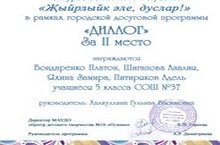 Ансамбль из учащихся 5О класса: Харасов Данияр, Шигапова Алина, Яхина Замира и Бондаренко Платон (5В класс) с песней «Күңелле безнең туган шәһәр» заняли 2 место. Поздравляем ребят!