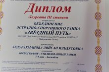 Поздравляем объединение эстрадно-спортивного танца «Звёздный путь» (руководитель Абдурахманова Л.И.), награждённое дипломом Лауреата III степени в номинации «Хореография – стилизованный танец» в Международном конкурсе-фестивале «Осенний марафон талантов» при информационной поддержке министерства культуры Российской Федерации. Желаем дальнейших успехов в творчестве и побед!