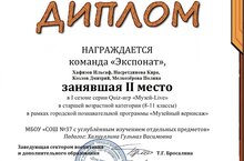 Поздравляем команду “Экспонат” (учащиеся 9В класса: Хафизов Ильсаф, Козлов Дмирий, Насретдинова Кира и Мелкозёрова Полина), занявшую II место в первом сезоне серии Quiz-игр «Музей-Live» в старшей возрастной категории в рамках городской познавательной программы «Музейный вернисаж».