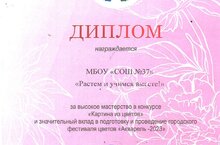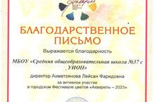 Выражается благодарность МБОУ "Средняя общеобразовательная школа №37 с УИОП" за активное участие в городском фестивале "Акварель - 2023"