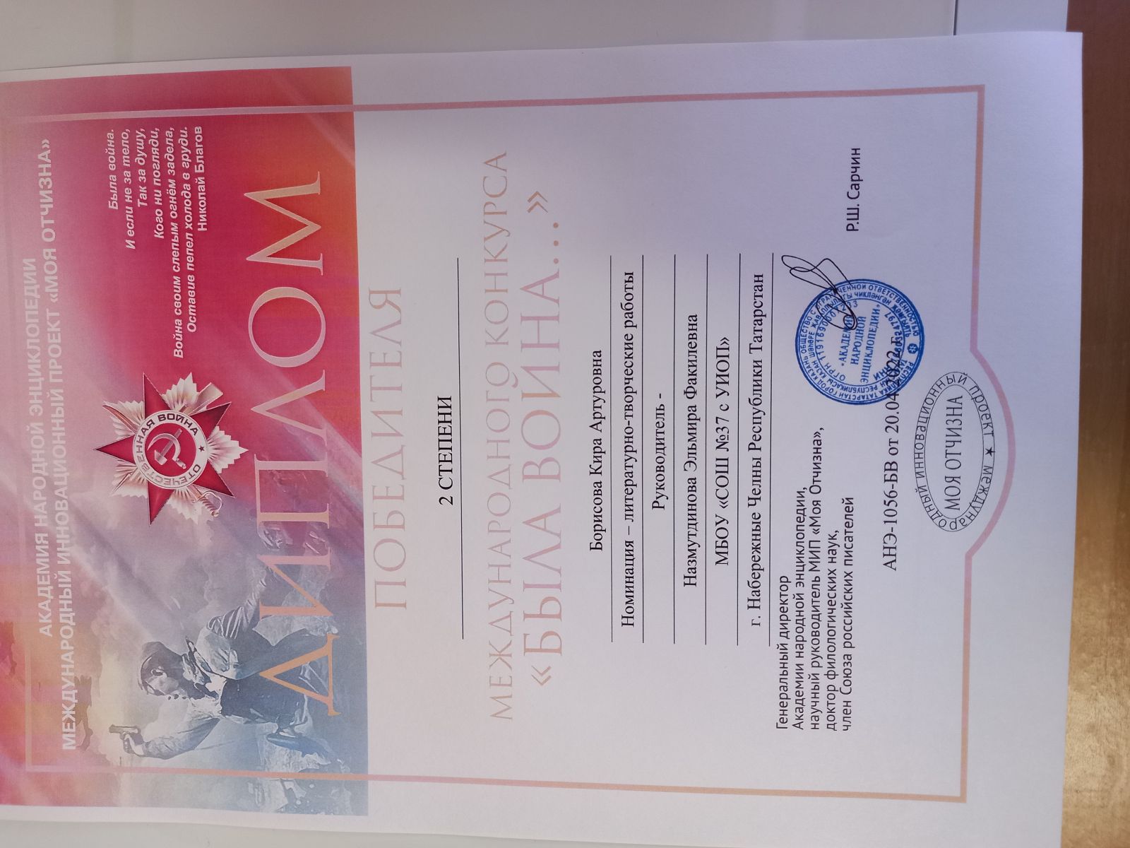 Сердечно поздравляем Борисову Киру, ученицу 9В класса, награждённой дипломом победителя 2 степени, в международном конкурсе «Была война…» в номинации литературно-творческие работы. Благодарим руководителя, учителя родного языка и литературы, Назмутдинову Эльмиру Факилевну за подготовку и победу в данном конкурсе. Желаем дальнейших побед и высот! (смотреть)