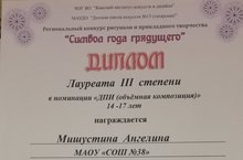 В декабре 2018 года состоялся региональный конкурс рисунков и прикладного творчества "Символ года грядущего - 2019" и сегодня стали известны результаты. В конкурсе приняли участие 435 человек (396 обучающихся и 39 педагогов) из 60 образовательных организаций 12 муниципальных районов РТ. Участвуя в конкурсе ученица 8 Б класса Мишустина Ангелина (учитель Халиуллина Е.В.) получила диплом 3 степени в номинации декоративно-прикладное творчество в возрастной группе 14-17 лет.