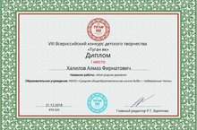 21.12.2018 года прошел XIII Всероссийский конкурс детского творчества “Туган як”. По итогам конкурса Халилов Алмаз (7в) (руководитель Ахмадеева Ф.С.) занял 1 место и награжден Дипломом I степени.