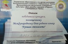 14.12.2018 года в в МО ДДТ №15 прошел городской конкурс “Туган шәһәрем – Яр Чаллы” “Родной город – Набережные Челны”, который проходил в рамках городской программы “Мин татарча сөйләшәм” (Я разговариваю по татарски). По итогам конкурса команда учащихся 8а класса в составе Зарипова Динара, Зайнуллиной Динары, Вазиева Айдара, Исмагиловой Динары (руководитель Ахмадеева Ф.С.) награждена Дипломом III степени.