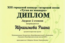 Раисом Республики Татарстан Р.Н. Миннихановым 2023-й год в Татарстане объявлен «Годом национальных культур и традиций». С целью пропаганды татарского национального музыкального творчества, сохранения татарских традиций, приобщения детей к татарскому песенному искусству 22 ноября в Детской школе искусств№7 прошёл XIII муниципальный конкурс татарской песни «Туган як моннары». В конкурсе из нашей школы приняла участие учащийся 6 А класса Ибрагимова Риана. Она стала лауреатом 2 степени. Поздравляем её и желаем дальнейших творческих побед!