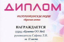 Поздравляем школьный отряд "Комета" ( 7 Б класс, руководитель отряда Сафина Л.И.) со 2 местом в Республиканской акции "Красная лента", приуроченной Всемирному Дню борьбы со СПИДом. В акции приняли ученики 7-9 классов школы. Цель акции - привлечь внимание школьников к проблеме СПИДа, проинформировать их о путях передачи ВИЧ, призвать к толерантному отношению к людям с ВИЧ.