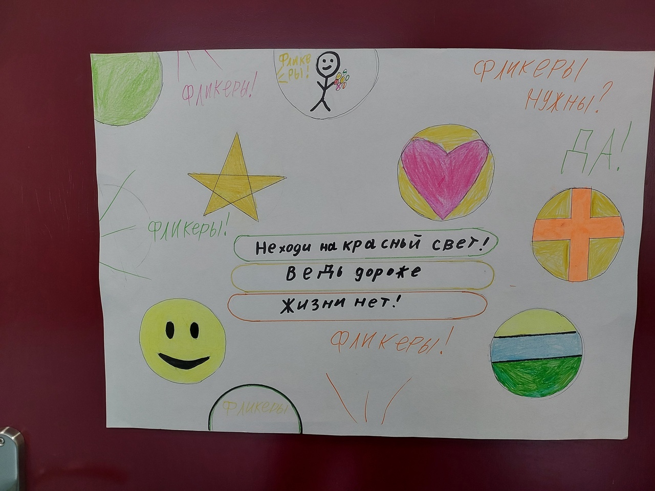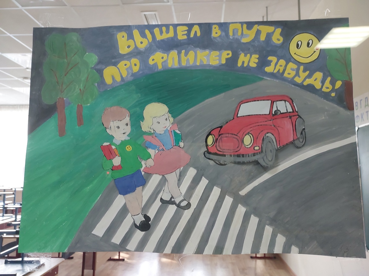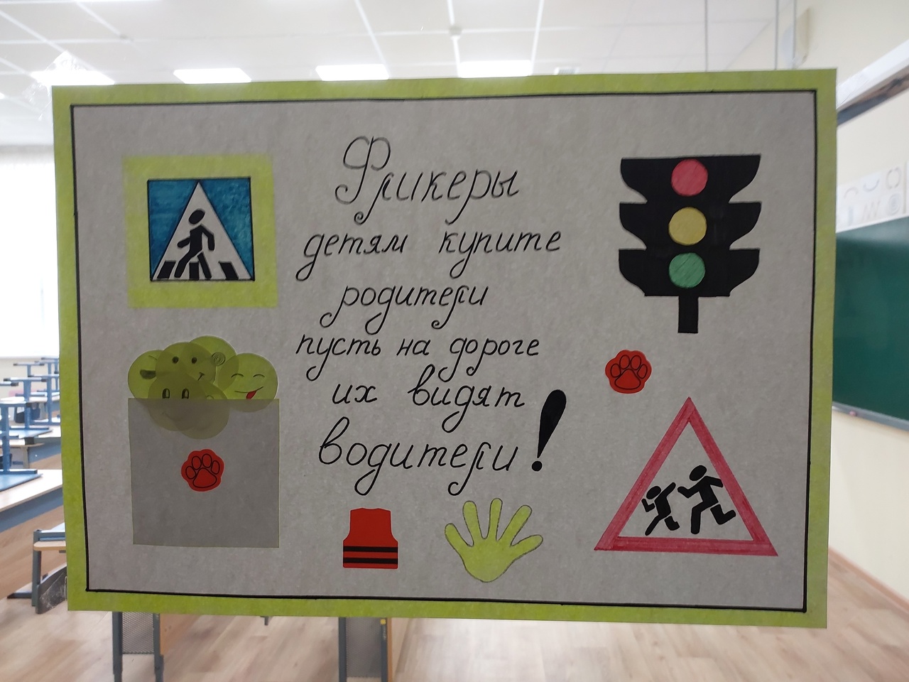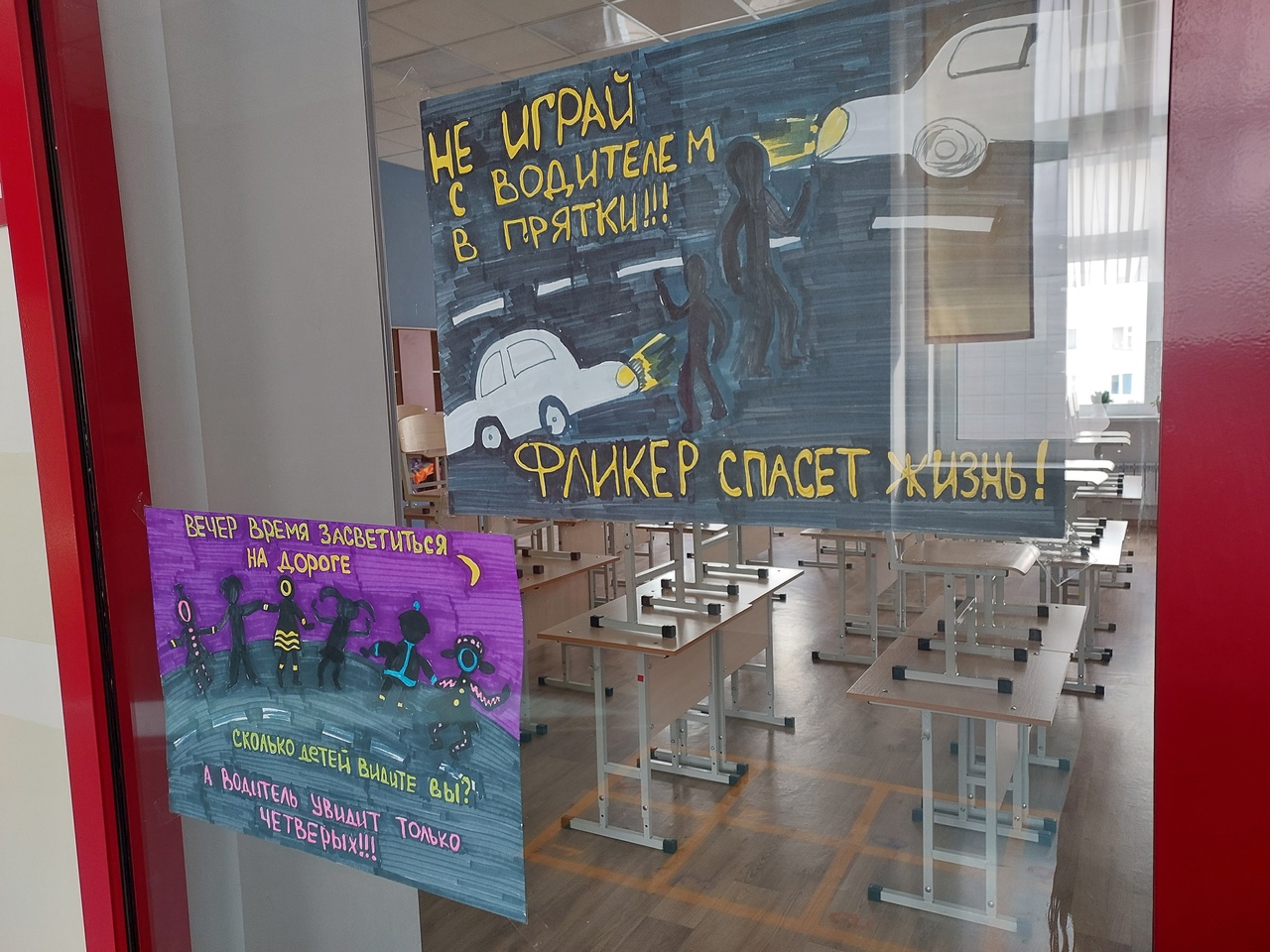 с 22 по 28 октября обучающиеся школы рисовали плакаты с лозунгами и призывами по ПДД, которыми затем оформляли витражи или двери кабинетов как очередное напоминание перед осенними каникулами для всех обучающихся школы о необходимости соблюдения правил дорожного движения, использования светоотражающих элементов (фликеров).