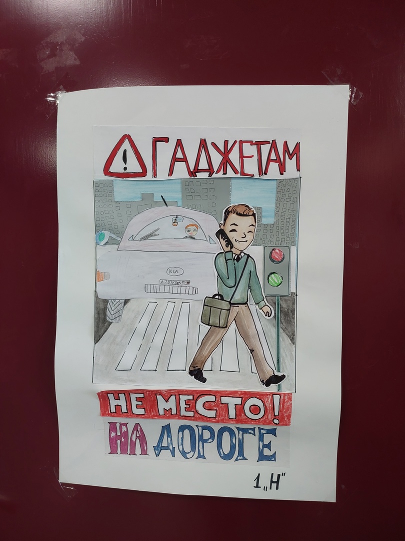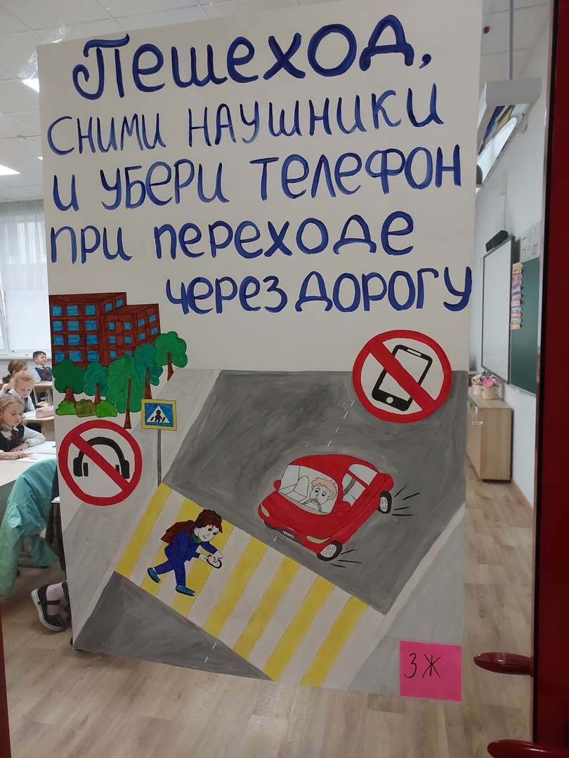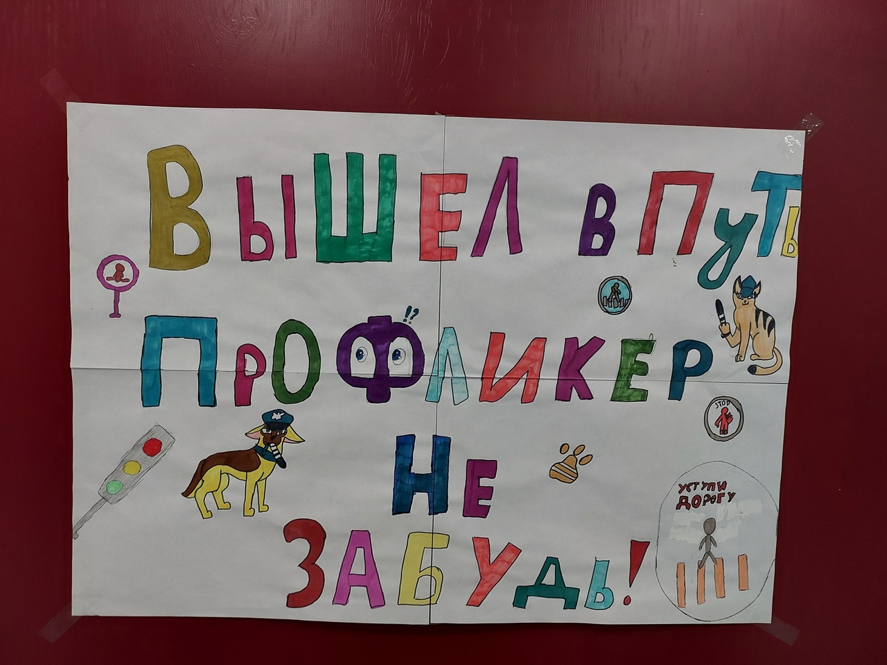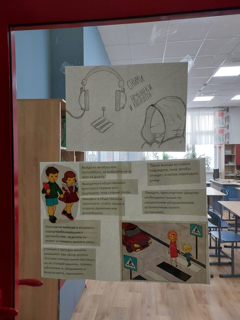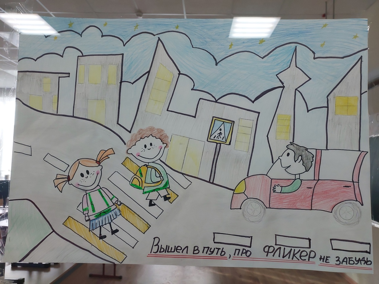 с 22 по 28 октября обучающиеся школы рисовали плакаты с лозунгами и призывами по ПДД, которыми затем оформляли витражи или двери кабинетов как очередное напоминание перед осенними каникулами для всех обучающихся школы о необходимости соблюдения правил дорожного движения, использования светоотражающих элементов (фликеров).