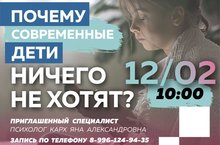 12 февраля в 10.00ч. в МАУ «МЦ «Заман» состоится «Workshop - практикум для родителей и работающей молодежи: «Почему современные дети ничего не хотят?» с участием психолога Карх Яны Александровны.