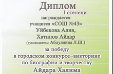 4 нче сыйныф укучылары Хатыйпов Айдар һәм Уйбекова Алия ( җитәкчеләре Абдуллина Л.Ш.) Айдар Хәлимнең тормыш юлы һәм иҗатына буенча “Чакматаш” (“Огниво” ) Балалар иҗаты үзәгендә уздырылган шәһәр викторинасында катнашып, I дәрәҗә дипломга лаек булдылар. Аларны җиңүләре белән котлыйбыз!