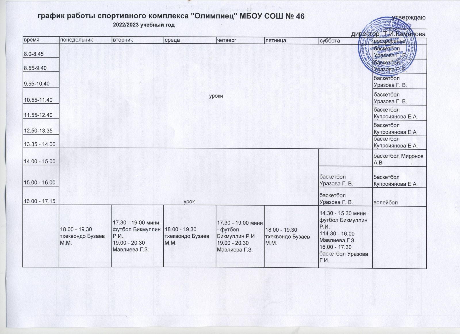 - График работы спортивного комплекса "Олимпиец" на 2023/2024 учебный год