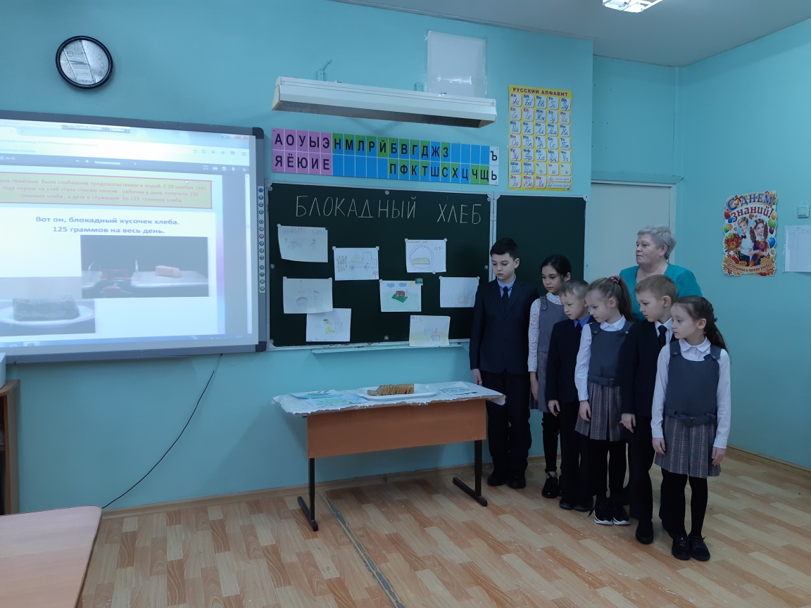 В рамках Всероссийской акции памяти "Блокадный хлеб" проводился классный час во 2 А классе (кл.рку. Потемкина И.Н.) Детям рассказали о жизни в кольце фашистской осады: как выживали долги 872 дня, не сдавались, даже когда устоять казалось невозможным, что значили для ребенка в блокадном городе 125 граммов хлеба. "Я помню крошки,которые оставались. Собирала их по столу и спрашивала: "Мам, почему так хлеба мало?" Она говорила: "Победа будет - будет много хлеба!"