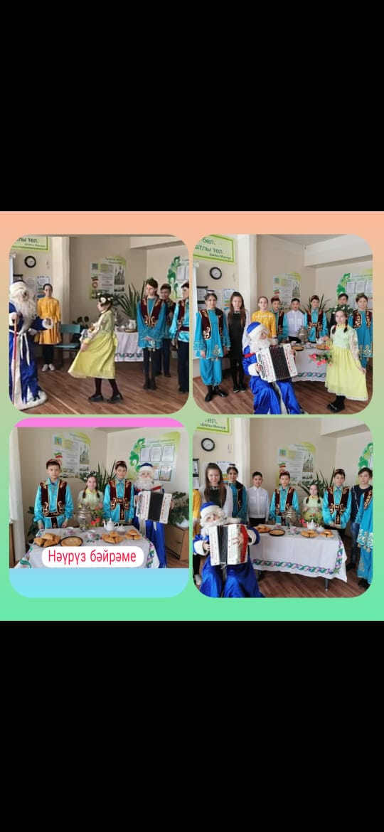 Нәүрүз – төрки һәм фарсы телле халыкларның бик борынгыдан килгән бәйрәме. Ул 21 мартта көн белән төн тигезләшкән көнгә туры килә. Шул уңайдан мәктәбебездә бәйрәм үткәрелде. Укучылар бәйрәмдә төрле бәйгеләрдә катнашып көч сынашты, күңел ачтылар. Бәйрәмнән соң коймак белән чәй эчтеләр.