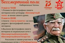 - онлайн-акция подразумевает публикацию фотографии ветерана с рассказом о нем в социальных сетях Вконтакте, Instagram и др. с указанием хештегов #БессмертныйполкОнлайн, #БессмертныйполкТатарстан с 20.04.2020 по 9.05.2020