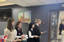 Учащиеся школы №5 вручили всем присутствующим праздничные открытки, сделанные учениками школ района.