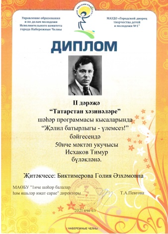 «Татарстан хәзинәләре»шәһәр программасының «Җәлил батырлыгы үлемсез» конкурсында 3А сыйныф укучысы Гайнетдинова Диана (укытучысы Нәҗипова З.Р.) һәм 3Б сыйныф укучысы Исхаков Тимур (укытучысы