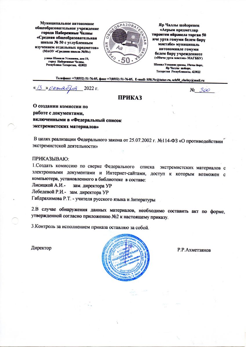 Приказ о создании комиссии по работе с документами, включенными в "Федеральный список экстремистских материалов"
