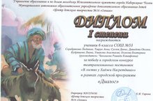 Ученики нашей школы,под руководством Чанышовой Р.К., приняли участие во втором этапе – конкурсе театрализованных постановок на татарском языке «Хуҗа Насрытдинда кунакта» («В гостях у Хаджи Насретдина») на базе «ЦДТ № 16 «Огниво». ПОЗДРАВЛЯЕМ С 1 МЕСТОМ!