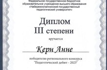Учащаяся 11 класса Анна Керн стала победителем в региональном конкурсе "Педагогический дебют - 2023", проводимом НГПУ. Научный Руководитель учитель истории и обществознания Минченкова Е.В.