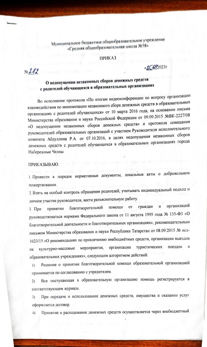 Приказ о недопущении незаконных сборов денежных средств с родителей обучающихся в образовательных организациях