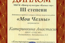 Центр культуры «Кызыл тау» в рамках празднования 85-летия города Набережные Челны организовал и провёл конкурс детских творческих работ «Мои Челны». Учащиеся 4-5 классов приняли активное участие в данном конкурсе, а Катеринкина Анастасия, ученица 4Б класса, завоевала Диплом III степени в номинации «Конструирование и моделирование». Так держать!