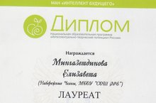 Мингазетдинову Елизавету – лауреата «Весеннего» тура 2014/2015 учебного года Всероссийского заочного конкурса «Познание и творчество» в номинации «English for Winners» (7-8 кл.)
