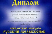 Подведены итоги Всероссийского конкурса «Русский медвежонок – языкознание для всех». Ученицы 2А класса Расимбетова Юлия и Гараева Вика (учитель Славина В.Ю.), ученицы 8А класса Махмутова Анастасия и Карлина Ксения (учитель Наврузова И.Н.), ученица 9А класса Бузина Александра (учитель Белоусова Р.М.) завоевали диплом победителя. Поздравляем!!!