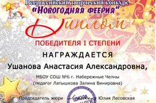 Подведены итоги всероссийского творческого конкурса «Новогодняя феерия»: диплом I завоевали Ушанова Анастасия и Ятникова Анастасия (9Б класс), руководитель Латышкова З.В.