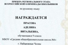 Поздравляем Прасову Аделину, ученицу 9А класса, призера регионального этапа Всеросийской олимпиады школьников по русскому языку и астрономии!