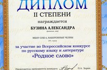 20 декабря 2014 года прошёл Всероссийский конкурс по русскому языку и литературе «Родное слово». Дипломом II степени награждена Бузина Александра, ученица 9А класса. Дипломантами III степени стали Алекбаев Ренат, 5А класс; Ермакова Валерия, 6А класс; Матлахова Полина, 6А класс; Низамутдинова Руслана, 7Б класс; Колотилова Екатерина, 7А класс; Ракитянский Александр, 7В класс; Прасова Аделина, 9А класс.