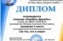 Учащиеся 4Б класса приняли участие в «Квест Атлантиды» в рамках городской военно–патриотической программы «В нашу гавань заходили корабли…» в ДМЦ № 9. Команда «Корабль Дружбы» заняла 2 место в конкурсе рисунков «В синем море, белой пене…», фотоконкурсе «Командир счастливой «Щуки» и 3 место в интерактивной игре «За тех, кто в море». (Руководитель Митрева А.Н.)