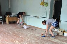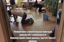 Ремонтно - строительная бригада занимается благоустройством школы, моют полы, чистят пол от краски