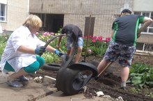 Учащиеся школы совместно с уителями укращают участок , применяя архитектурный дизайн