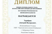 Тарабрина Дмитрия, Кадета 10П класса, призера регионального этапа всероссийской олимпиады школьников по Основам безопасности жизнедеятельности.