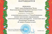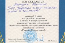 Команда кадетского корпуса «Пожарный спасатель» под руководством начальника корпуса подполковника запаса Люкшина И.Ю. приняла участие в V военно-тактических соревнованиях «К защите Родины готов!» в рамках VI республиканского слета кадет (город Чистополь). Поздравляем Миннулина Шамиля завоевавшего 2 место в стрельбе из пистолета.