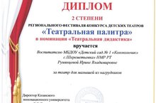 На базе ЦРР № 90 г. Нижнекамска прошёл региональный конкурс детских театров "Театральная палитра" среди воспитанников дошкольных образовательных учреждений. Фестиваль-конкурс проходил в двух номинациях: детский театр и театральная дидактика. В конкурсе участвовали детские сады Нижнекамского, Альметьевского, Елабужского, Заинского, Менделеевского, Чистопольского муниципальных районов, г. Набережные Челны; представлено 78 театров, 23 дидактического материала. От нашего детского сада в конкурсе принимала участие Румянцева Ирина Владимировна в номинации "Театральная дидактика" и заняла 2 почётное место. Поздравляем!!!