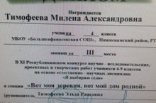 Поздравляем Тимофееву Милену и руководителя Тимофееву Эльзу Раисовну с призовым местом в XI Республиканском конкурсе научно-исследовательских, проектных и творческих работ учащихся 4-9 классов на основе естественно-научных дисциплин "Я выбираю село" в секции "Вот моя деревня, вот мой дом родной".