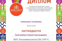 В региональном этапе Всероссийского конкурса научных, творческих и исследовательских работ "Вместе ярче" в номинации "Сочинение "Сила атома" Георгий Роутсалайнен стал призером. Наши поздравления!!!