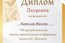 Еще одним ярким событием уходящей недели стало участие обучающегося 7б класса Кириллова Максима в VIII республиканской научно-практической конференции имени А.С.Пушкина. Он стал лауреатом конференции, к чему приложила немало усилий его руководитель Маслова И.В., учитель русского языка и литературы. Примите наши поздравления!!!