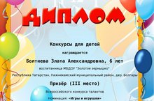| Короткое название: | МБДОУ "Детский сад"Золотое зёрнышко"с. Болгар" НМР,РТ |