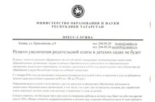 Информация от МОиН РТ "О повышении родительской платы в детских садах" 21.12.2015