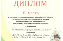 Наш педагог по музыкальному воспитанию Белогубкина Елена Валерьевна заняла III место в конкурсе дидактических игр и пособий по обучению двум государственным языкам среди воспитателей и специалистов дошкольных образовательных организаций г. Нижнекамска в номинации "Электронное методическое пособие". Поздравляем ее и желаем дальнейших успехов!!!