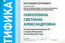29 сентября стартовала Всероссийская акция "10000 шагов к жизни", посвященной Всемирному дню сердца. Наша коллега Гайнуллина С.А. получила сертификат участника за прохождение маршрута № 1 в городе Нижнекамске. Будьте здоровы!