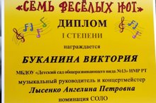 Наша воспитанница Буканина Виктория награждена Дипломом 1 степени в номинации "Соло" в Региональном конкурсе "Семь веселых нот" за песни "Милый край родной!" и "Поцелую бабушку"