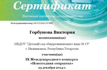 Наши воспитанники приняли учатие в IX Междунаровдном конкурсе "Новогодняя открытка", под чутким руководством творческих воспитателей: Шафеевой Н.П., Мустафиной Р.З. и Вифлянцивой Г.Р. Детям были торжественно врученны Сертификаты и педагогам Грамоты.