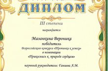 Дипломом III степени награждена воспитанница средней группы №8 Мазанкина Вероника Всероссийского конкурса "Тропинки к успеху" в номинации "Прикоснись к природе сердцем". Поздравляем Веронику и рукодителя Ганиеву А.М.