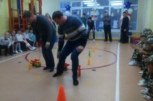 Сегодня в старших и подготовительных группах прошло развлечение “А ну-ка папы ”. Сначала дети показали мастерство строевой песни, умение маршировать. Затем пап разделили на две команды. Команда “Разведчиков” и “Пограничников” соревновались в умении на время собирать автоматы, перевозить боевую машину (игрушечные машинки), умение складывать из бумаги самолетики и запускать, кто дальше. Участники и зрители получили истинное удовольствие от интересного развлечения.
