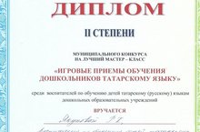 Подведены итоги муниципального конкурса на лучший мастер-класс "Игровые приемы обучения дошкольников татарскому языку" среди воспитателей по обучению детей татарскому (русскому) языкам дошкольных образовательных учреждений Нижнекамского муниципального района Республики Татарстан. Наш педагог Якупова Резеда Хамидовна награждена Дипломом II степени. Поздравляем победителя и желаем творческих успехов!